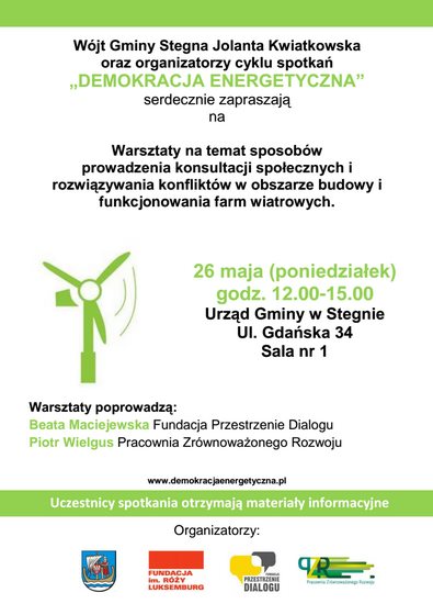serdecznie zapraszają na warsztaty na temat sposobów prowadzenia konsultacji społecznych i rozwiązywania konfliktów w obszarze budowy i funkcjonowania farm wiatrowych, które odbędą się 26 maja (poniedziałek) w godz. 12.00-15.00.
